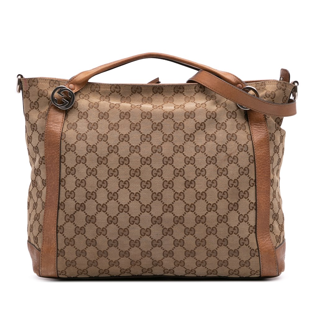 This Miss GG satchel features a canvas body with leather trim, rolled leather handles, a detachable flat leather strap, a top zip closure, and interior zip and slip pockets.
