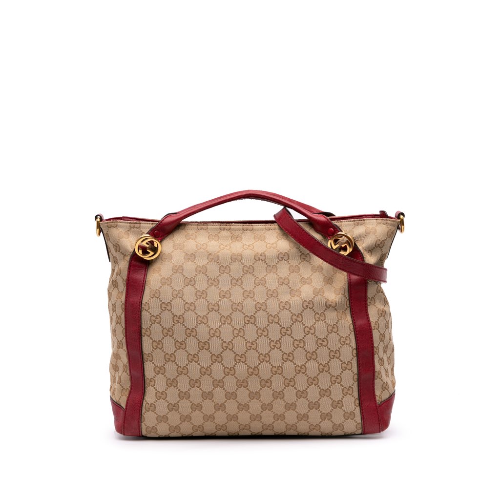 The Miss GG features a canvas body with leather trim, flat leather handles, detachable flat leather strap, top zip closure, and interior zip pocket.