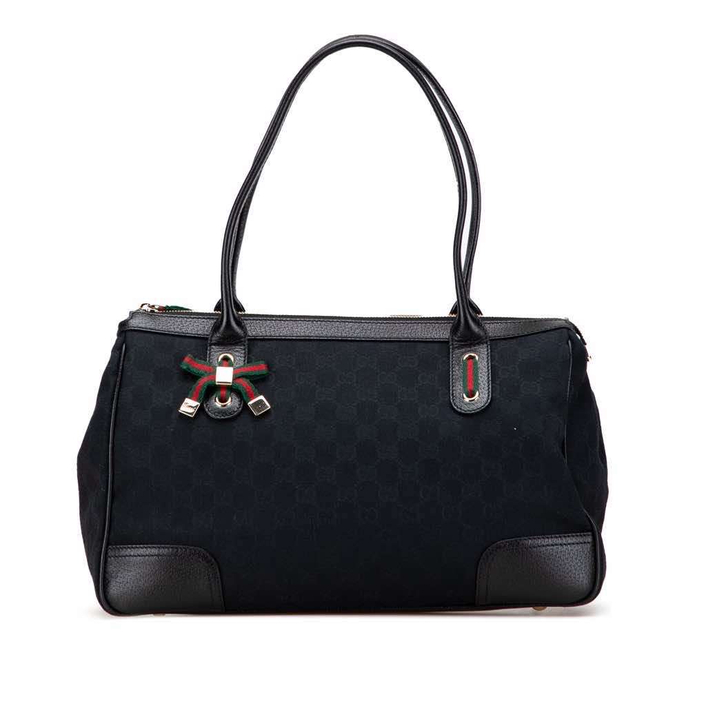 The Princy shoulder bag features a canvas body with leather trim and web details, flat leather straps, a top zip closure, and interior zip and slip pockets.