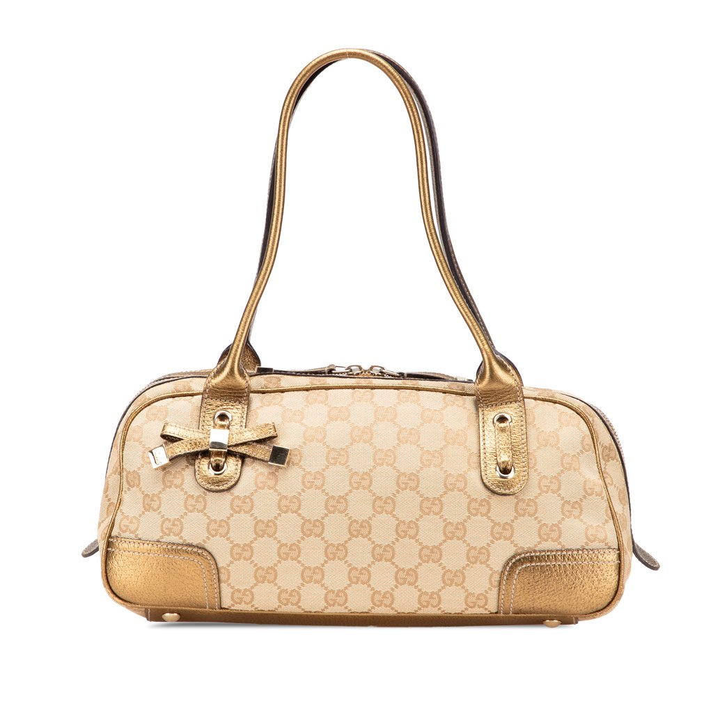The Princy shoulder bag features a canvas body with leather trim, flat leather shoulder straps, a top zip closure, and interior zip and slip pockets.