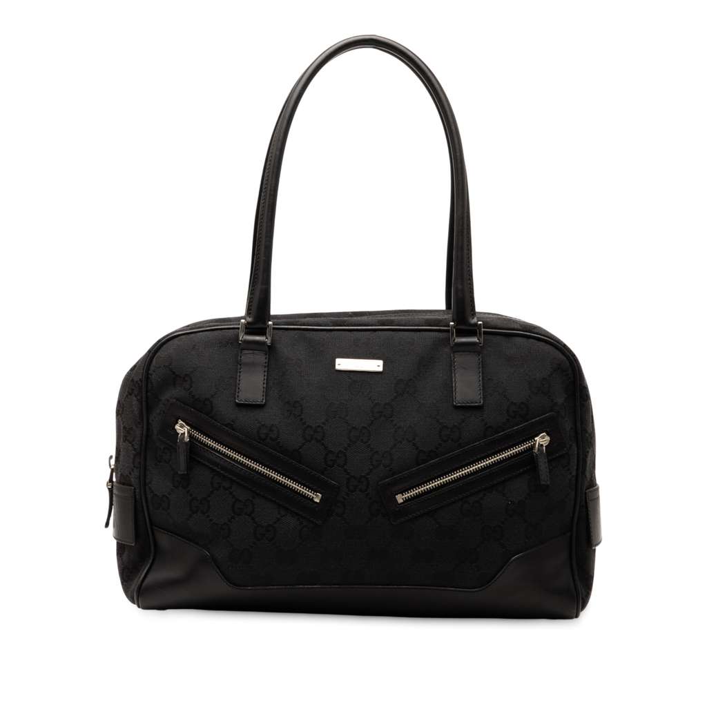 This shoulder bag features a canvas body with leather trim, rolled leather straps, a top zip closure, exterior zip pockets, and an interior zip pocket.