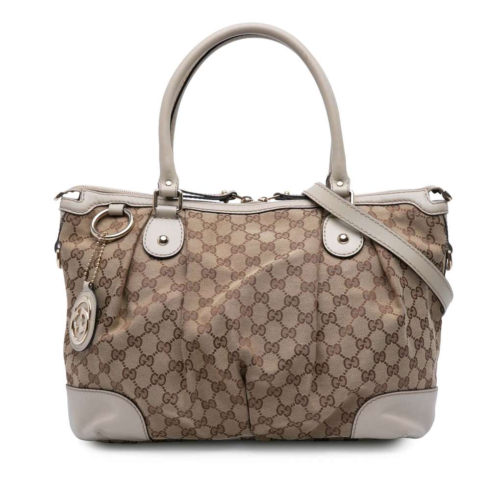 This satchel features a canvas body with leather trim, rolled leather handles, a detachable flat leather strap, a top zip closure, and interior zip and slip pockets.