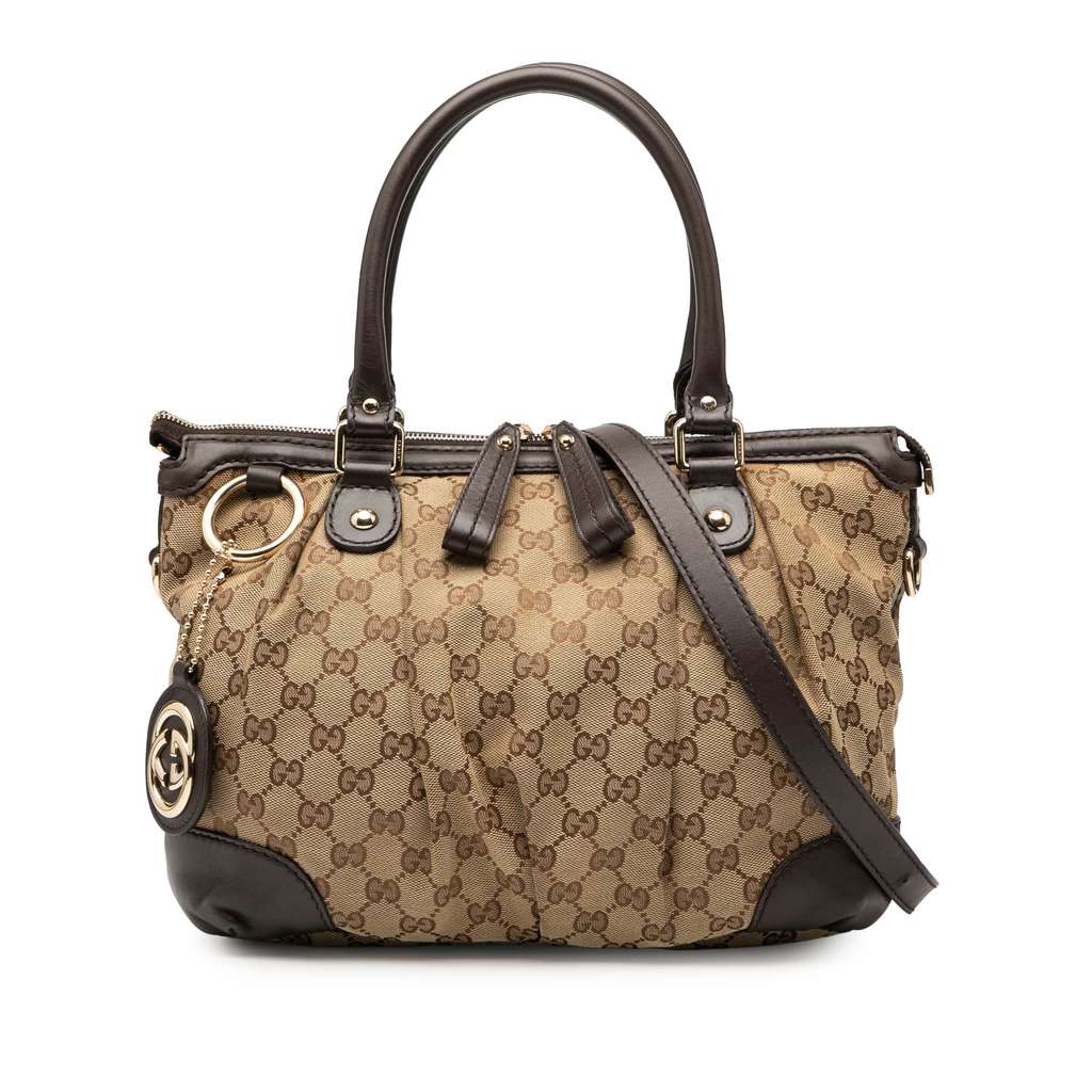 The Sukey features a canvas body with leather trim, rolled leather handles, a detachable flat leather straps, a top zip closure, and interior zip and slip pockets.