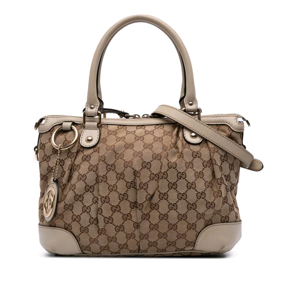 The Sukey features a canvas body with leather trim, rolled leather handles, a flat leather strap, a top zip closure, and an interior zip pocket.
