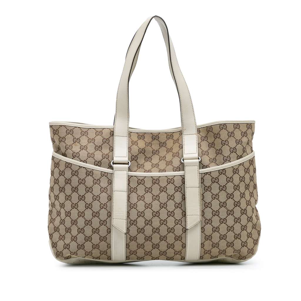 This tote bag features a canvas body with leather trim, flat leather straps, an open top with magnetic snap closure, exterior front slip pockets, and interior zip and slip pockets.