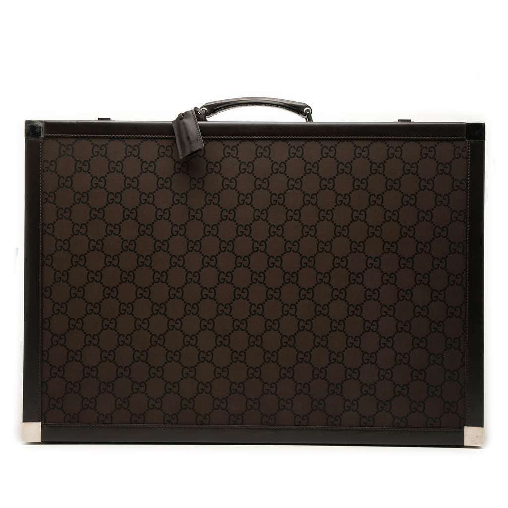 This travel bag features a canvas body with leather trim, a flat leather top handle, a top push lock closure, and interior slip pockets.