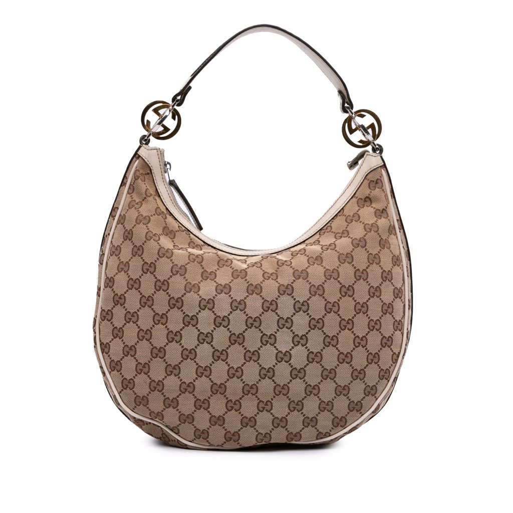 The Twins hobo bag features a canvas body with leather trim, a flat leather strap with metal hardware, a top zip closure, and interior zip and slip pockets.