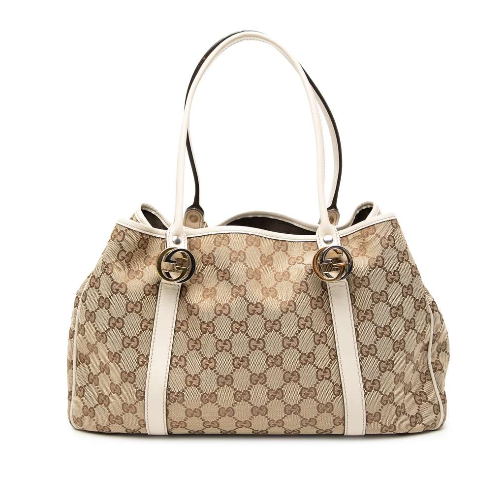 The Twins tote bag features a canvas body with leather trim, flat leather handles, an open top, and interior zip and slip pockets.