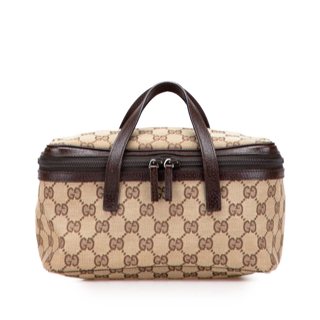 This vanity bag features a canvas body with leather trim, flat leather handles, a top zip-around closure, and an interior slip pocket.