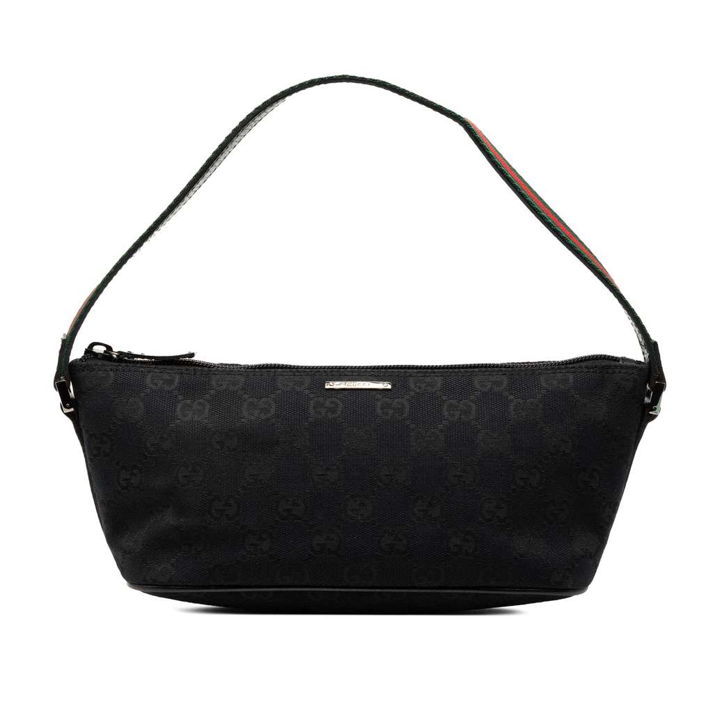 This baguette features a canvas body with leather trim, a flat canvas strap, and a top zip closure.