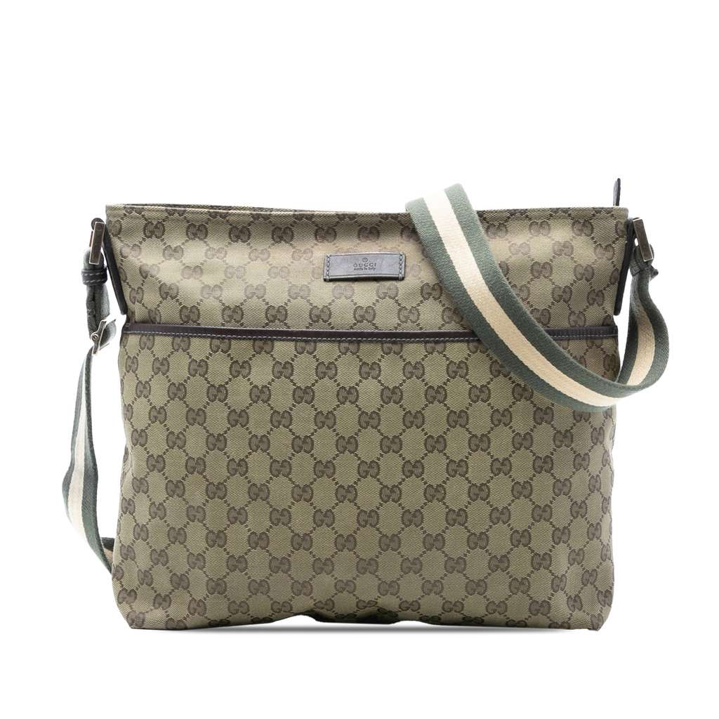 This crossbody bag features a canvas body with leather trim, an adjustable flat web strap, a top zip closure, an exterior slip pocket, and an interior zip pocket.
