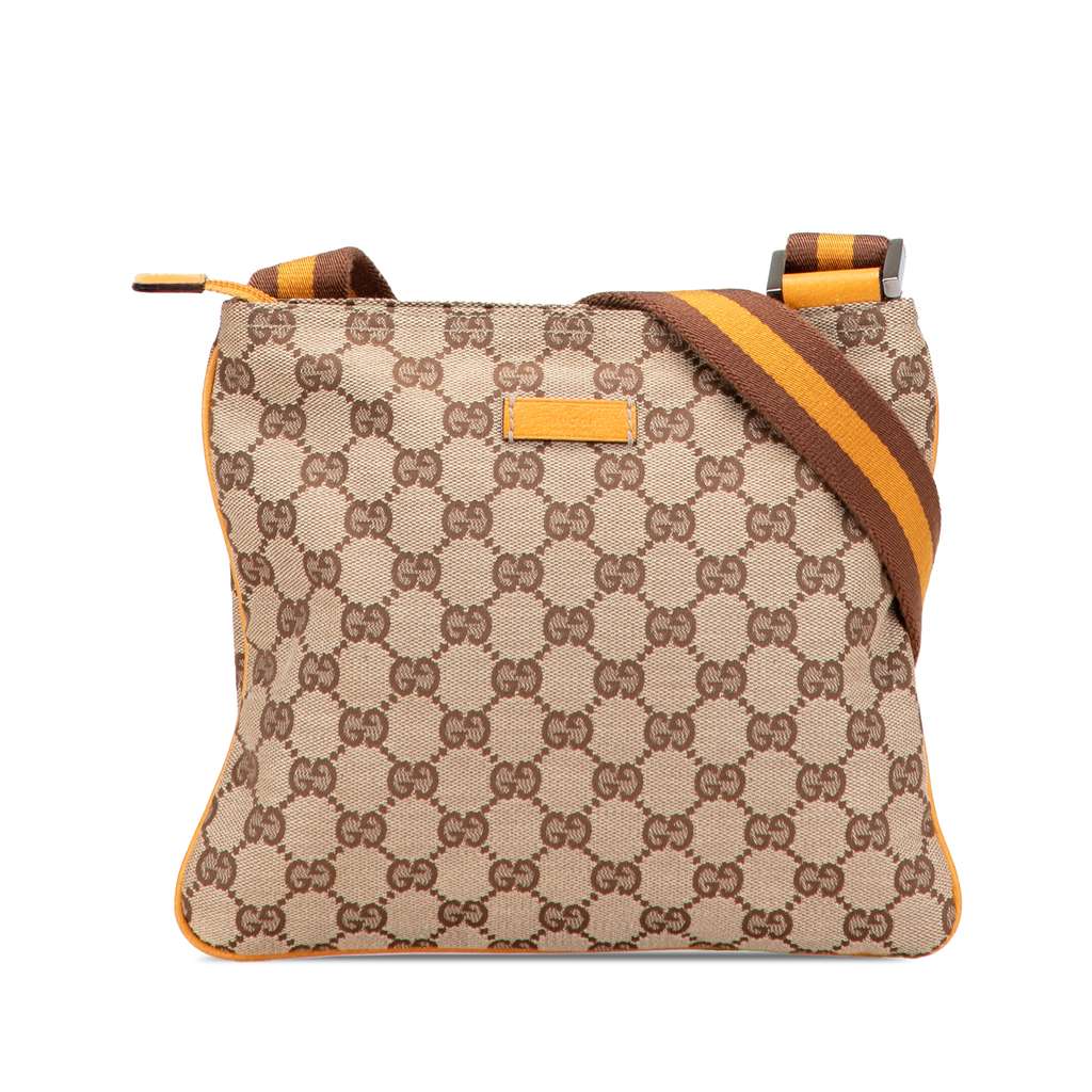 This crossbody bag features a canvas body with leather trim, an adjustable flat web strap, a top zip closure, and an interior zip pocket.