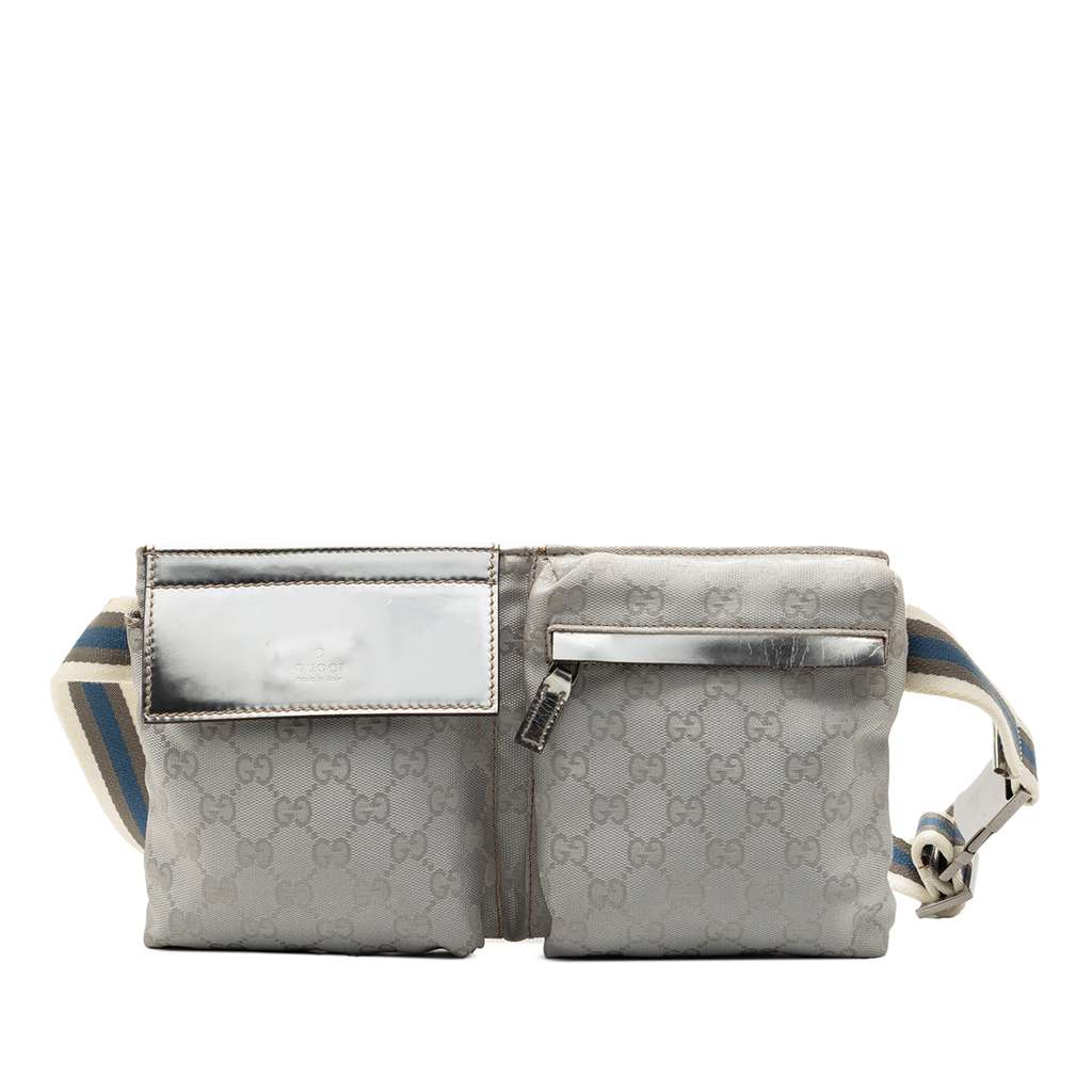 This belt bag features a canvas body, a flat web canvas belt strap, front flap and zip compartments, and a back zip pocket.