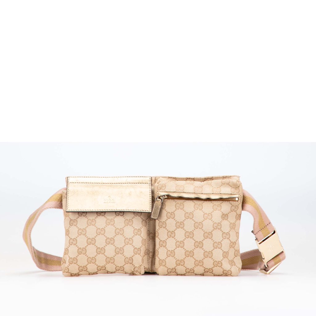This belt bag features a canvas body, an adjustable web canvas waist strap, exterior front flap and zip compartments, and a back exterior zip pocket.