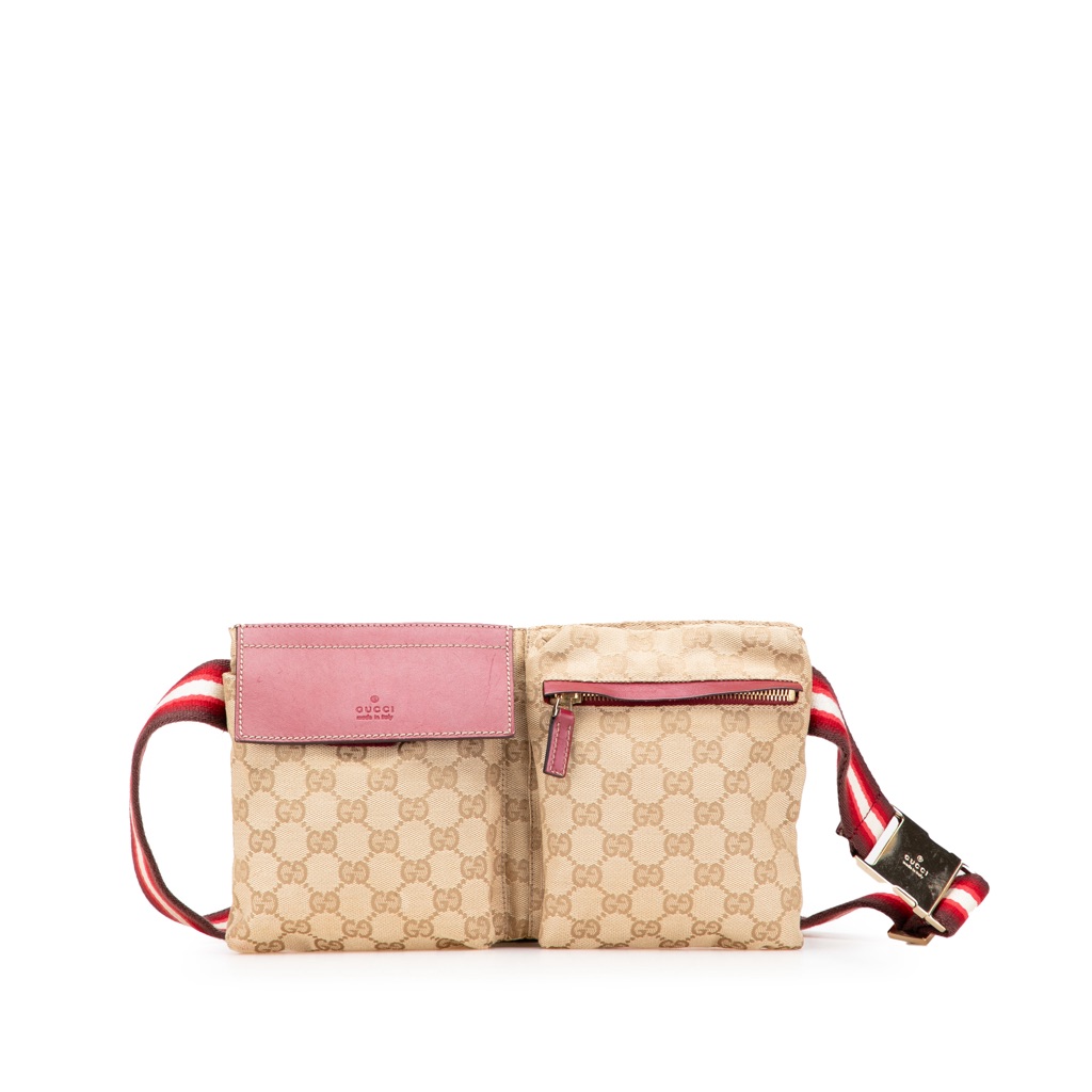 This belt bag features a canvas body, an adjustable flat web canvas waist strap, a front exterior flap and zip pockets, and a back exterior zip pocket.