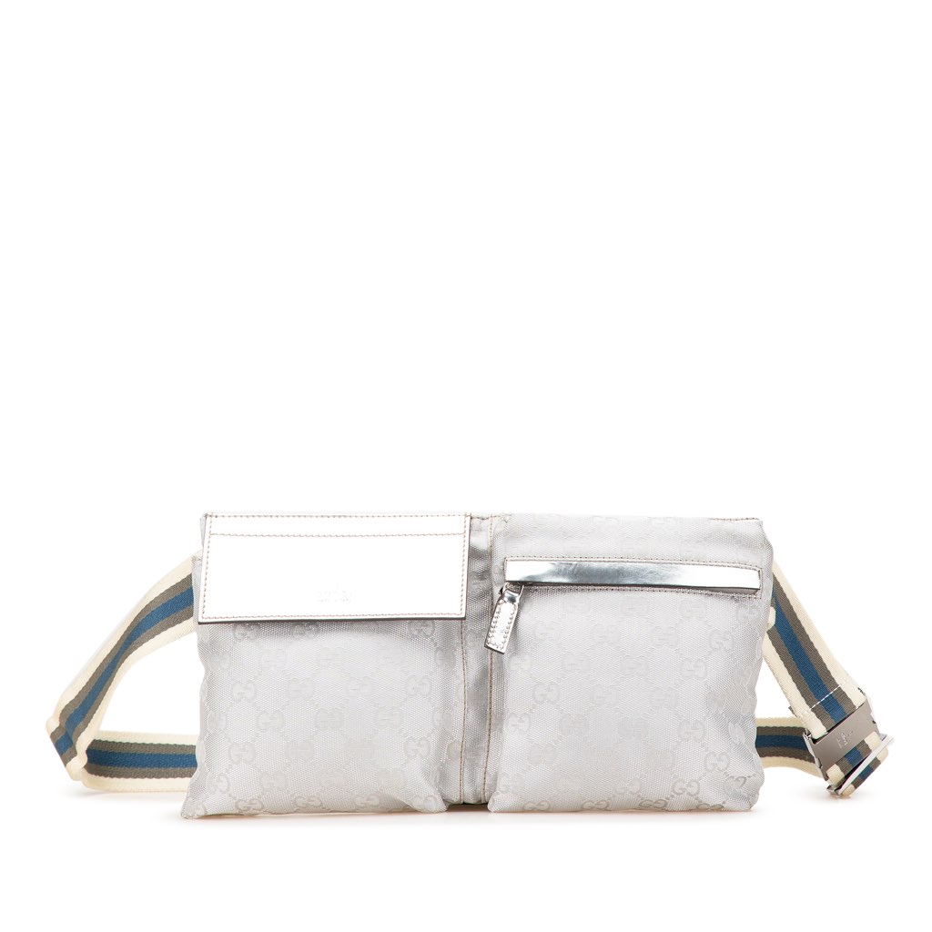 This belt bag features a canvas body, a flat web canvas belt strap, front flap and zip compartments, and a back zip pocket.