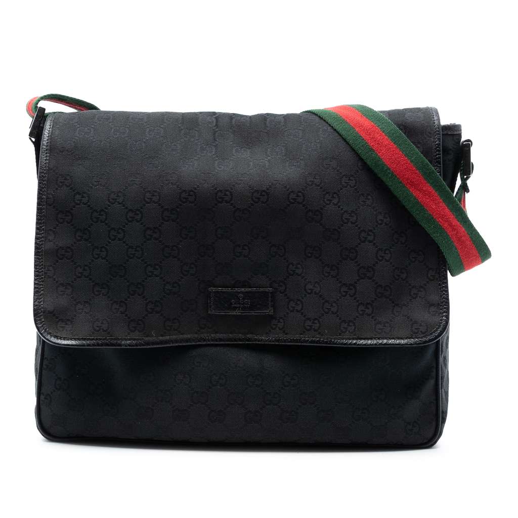 This crossbody bag features a canvas body with leather trim, an adjustable flat web strap, a top zip closure with a flap and a magnetic button closure, and interior zip and slip pockets.