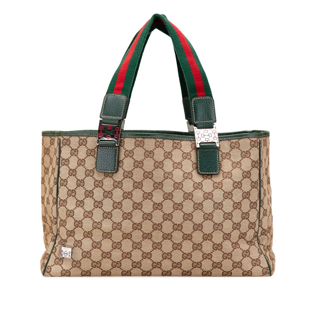 This tote bag features a canvas body with leather trim, flat web handles, an open top, an exterior slip compartment, and interior zip and slip pockets