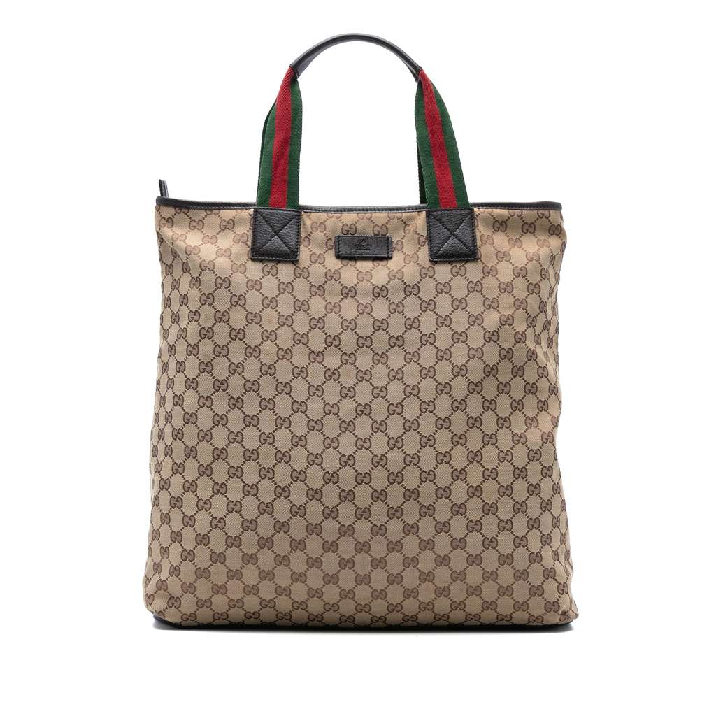 This tote bag features a canvas body with leather trim, flat leather handles with web strap details, a top zip closure, and interior zip and slip pockets. The handle/strap was repainted.