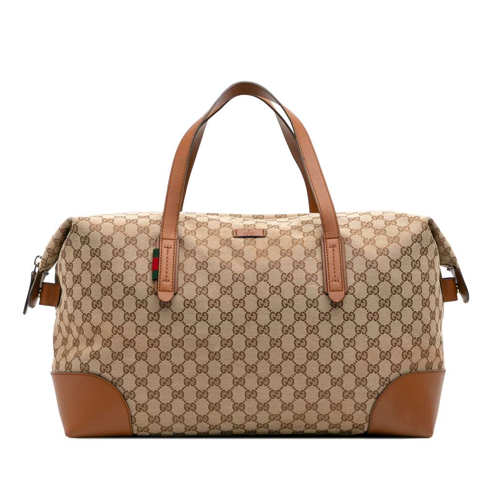 This travel bag features a canvas body with leather trim, flat leather straps, top zip closure, and interior zip and open pockets.