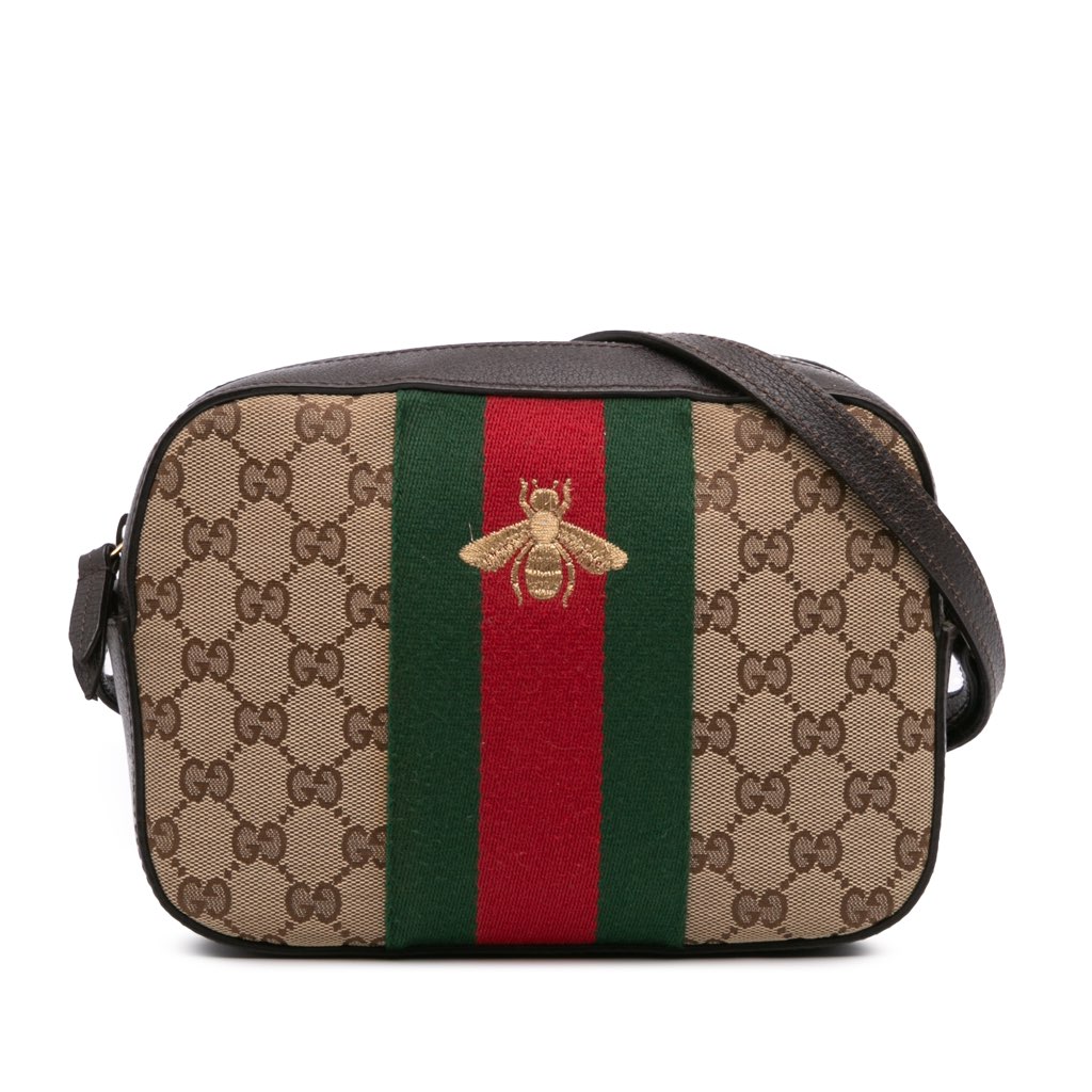 The Webby Bee crossbody bag features a canvas body with leather trim and web details, a flat leather strap, a top zip closure, and interior slip pockets.