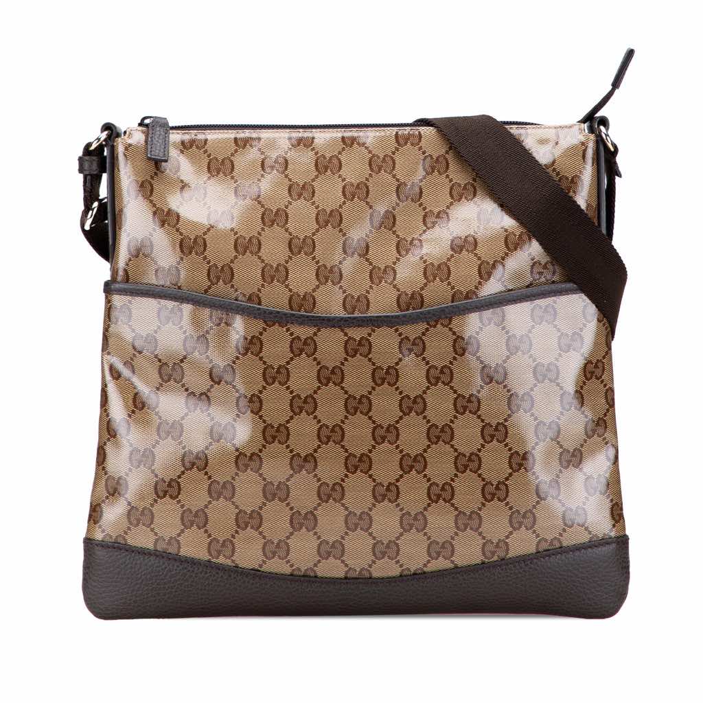 This crossbody bag features a coated canvas body with leather trim, a flat strap, a top zip closure, an exterior front slip pocket, and interior zip and slip pockets.