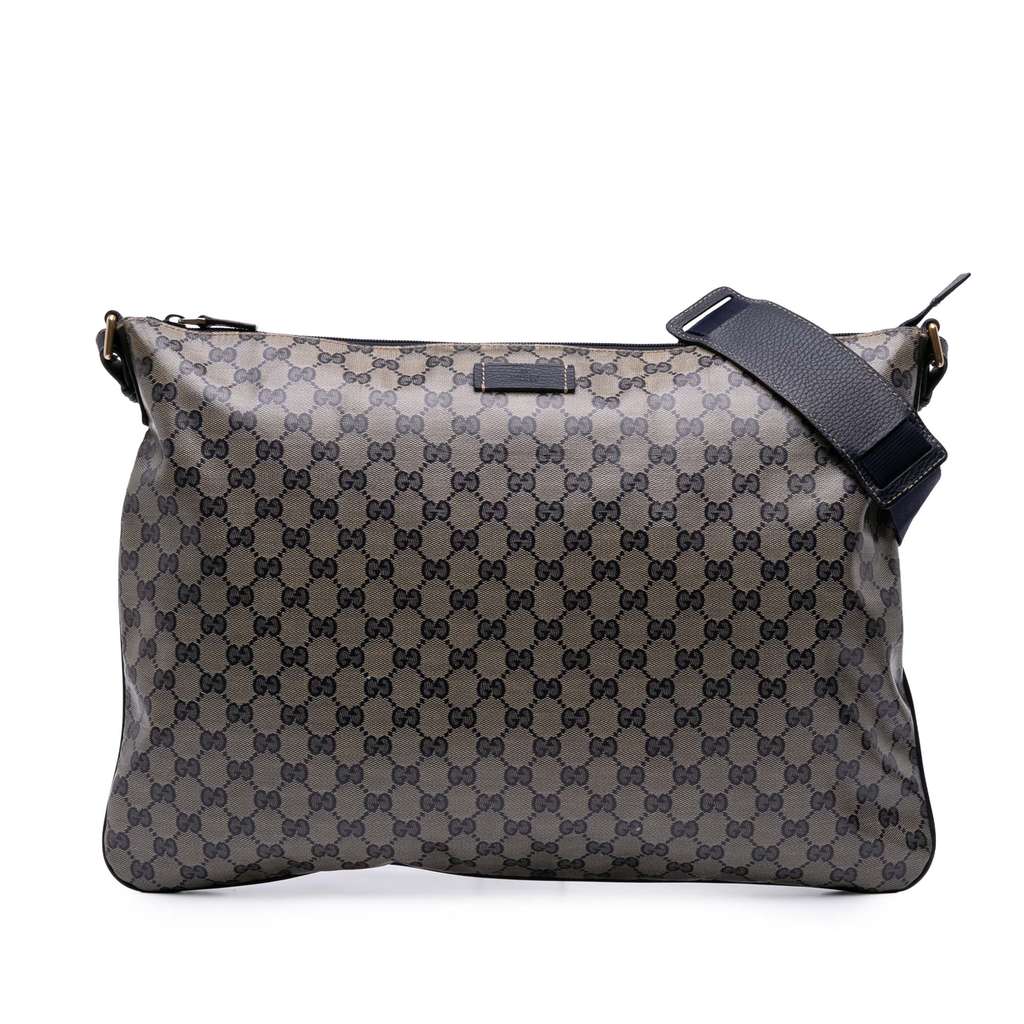 This crossbody bag features a coated canvas body with leather trim, a flat strap, a top zip closure, and an interior zip pocket.
