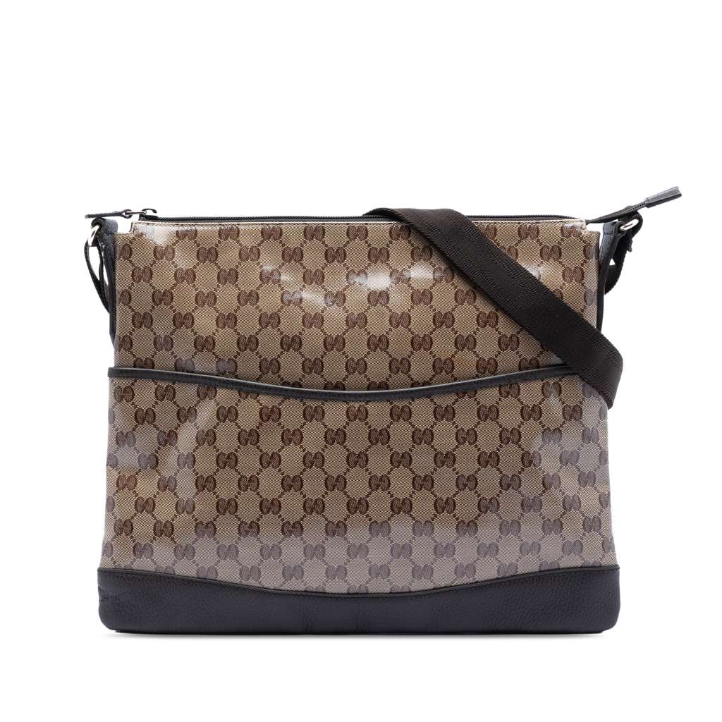 This crossbody bag features a coated canvas body with leather trim, an adjustable flat canvas shoulder strap, a top zip closure, an exterior front slip pocket, and an interior slip pocket.