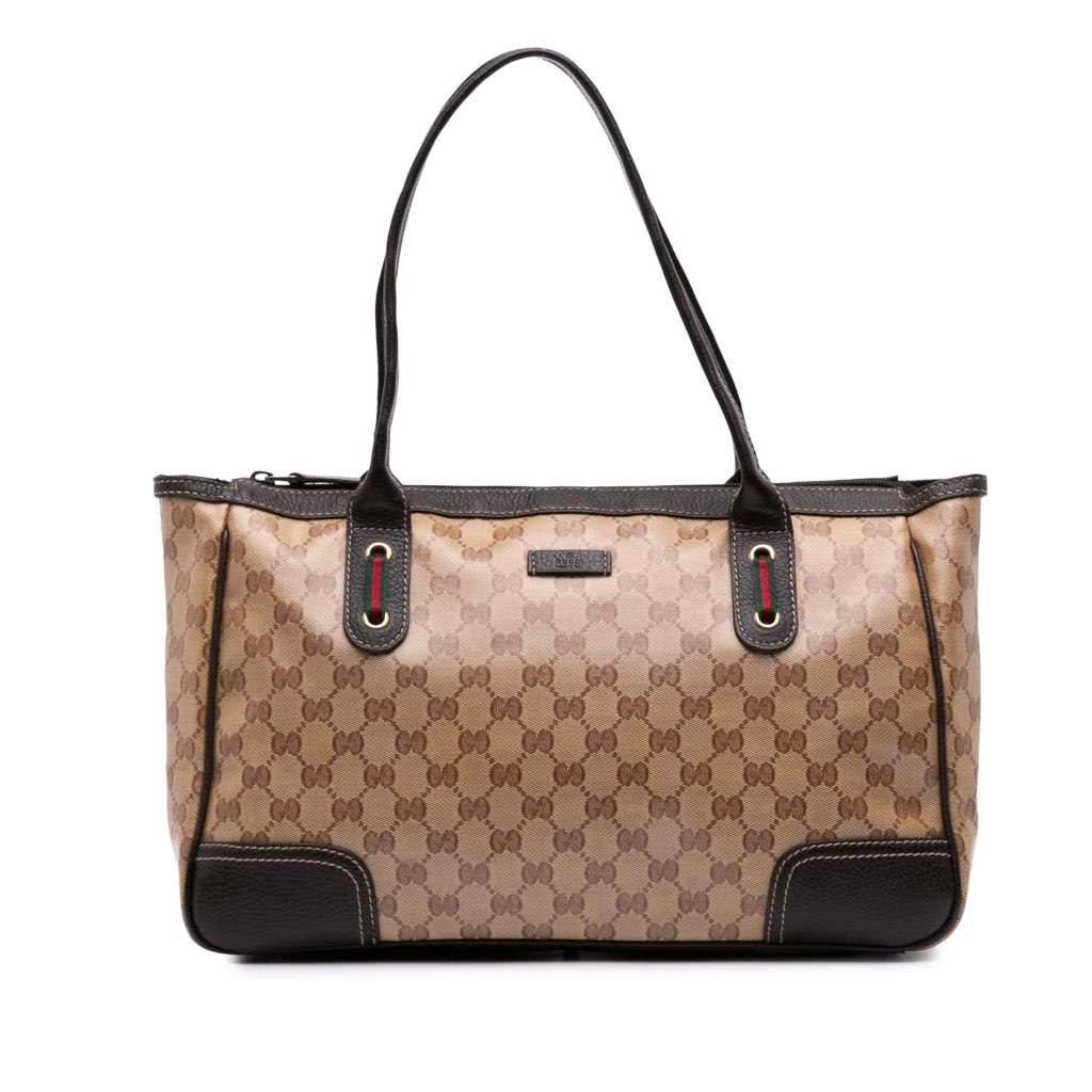 The Princy tote bag features a canvas body with leather trim, rolled leather handles, a top zip closure, and interior zip and slip pockets.