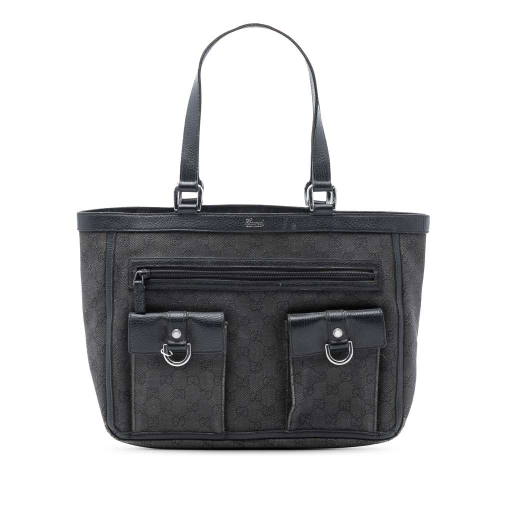 The Abbey D-Ring tote bag features a denim body with leather trim, flat leather straps, an open top with a magnetic closure, front exterior zip and flap pockets, and an interior zip and slip pockets.