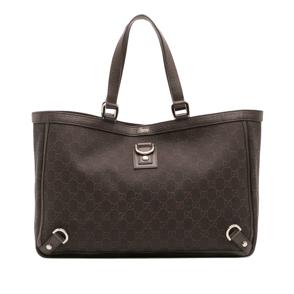 This Abbey D-Ring tote bag features a denim body with leather trim, flat leather straps, an open top with a magnetic closure, and interior zip and slip pockets.