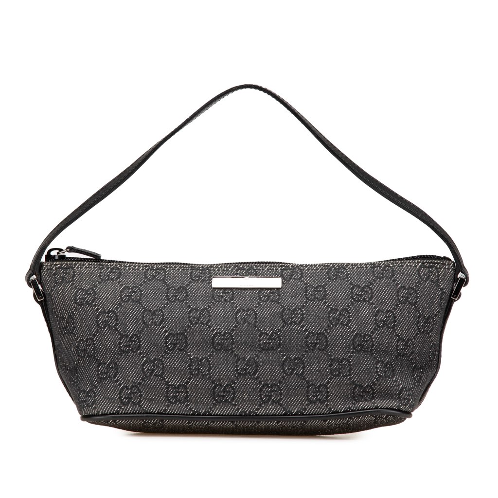 This baguette features a denim body with leather trim, a flat leather strap, and a top zip closure.