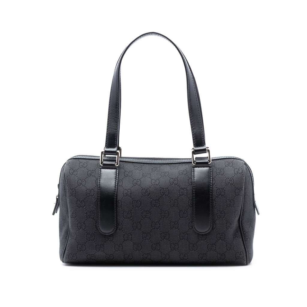 The Charmy Boston bag features a denim body with leather trim, flat leather straps, a top zip closure, and an interior zip and slip pockets.