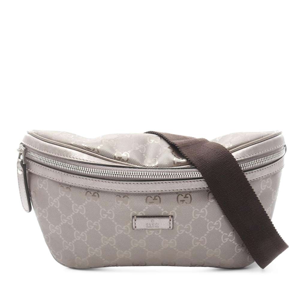 This belt bag features a coated canvas body with leather trim, an adjustable flat canvas waist strap, a front zip closure, and an interior slip pocket.