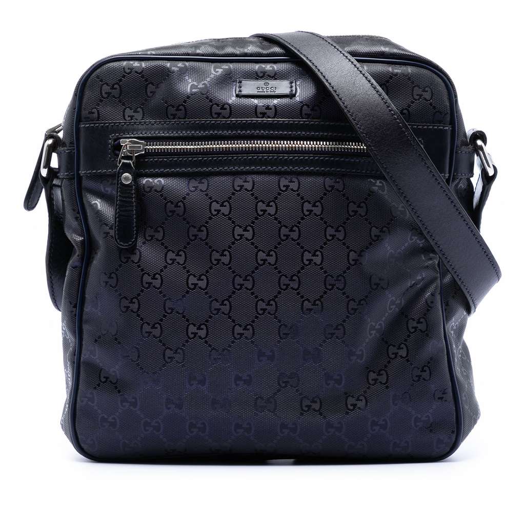 This crossbody bag features a coated body with leather trim, an adjustable flat strap, a top zip closure, an exterior front zip pocket, and interior zip and slip pockets.