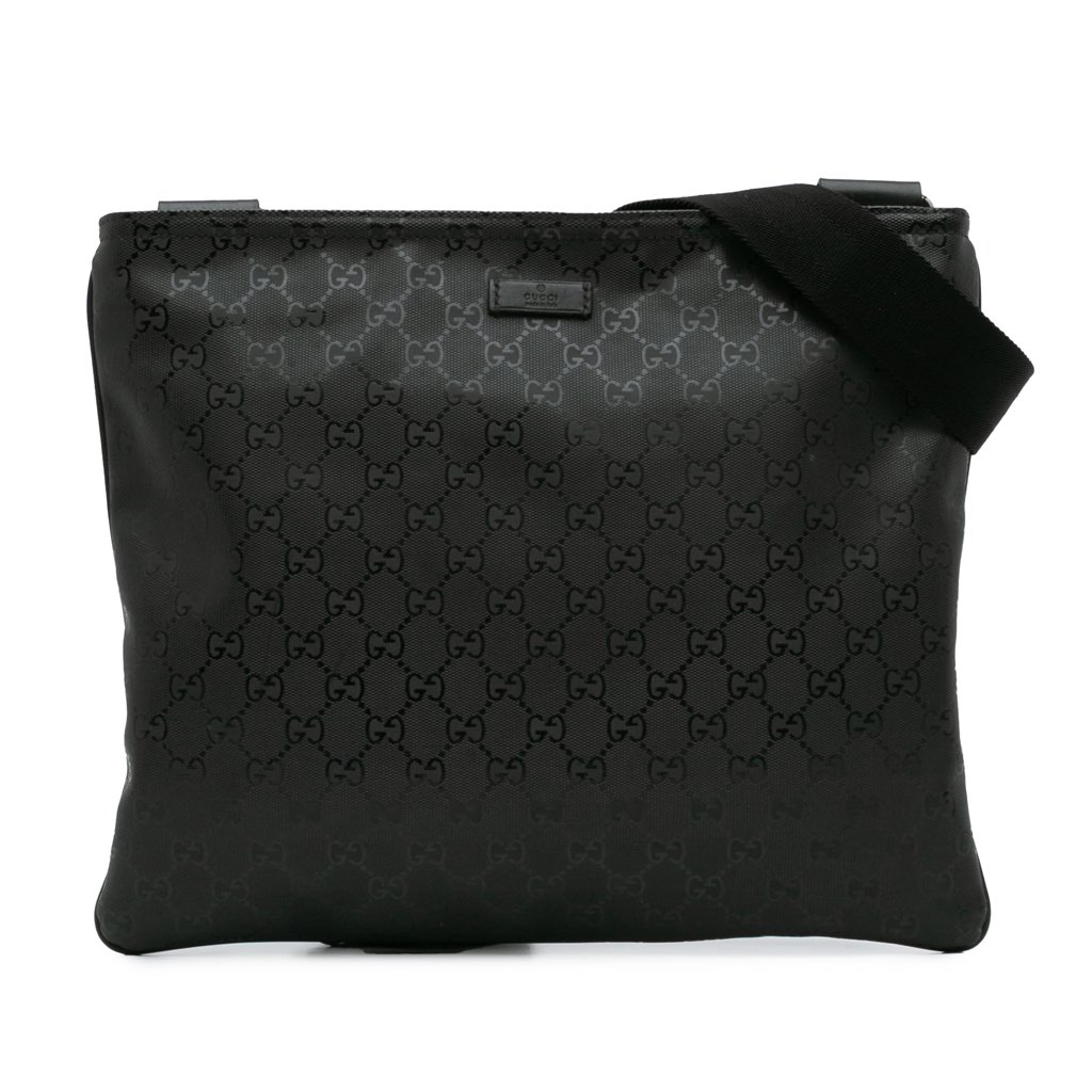 This crossbody bag features a coated canvas body with leather trim, an adjustable flat canvas strap, a top zip closure, and an interior zip pocket.