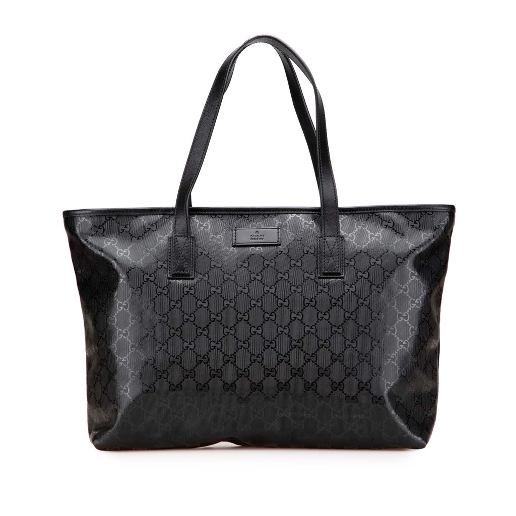 This tote bag features a coated canvas body with leather trim, flat leather straps, a top zip closure, and interior slip and zip pockets.