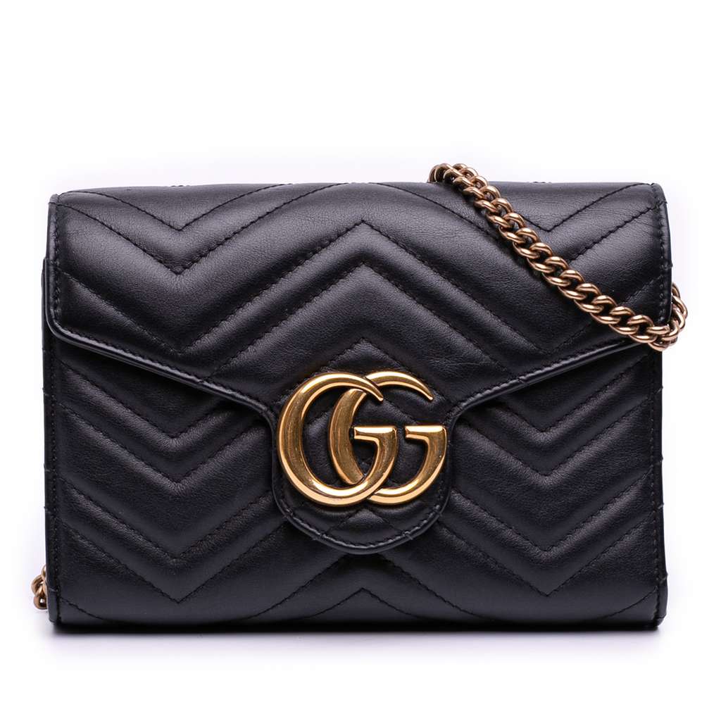 This wallet on chain features a quilted leather body, a chain link shoulder strap, a front flap with snap button closure, and interior zip and slip pockets.