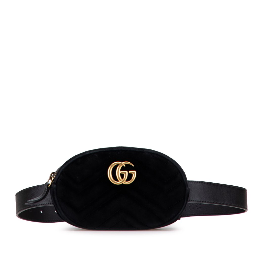 This belt bag features a velvet body, an adjustable and detachable flat leather strap, a top zip closure, and an interior slip pocket.
