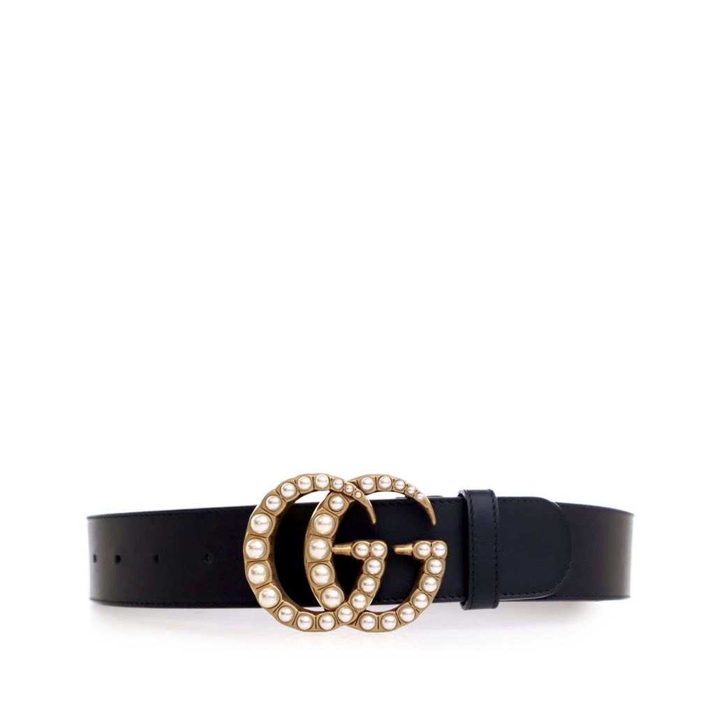 This belt features a leather body, a gold tone double G hardware with faux pearl details, and a peg-in-hole closure.