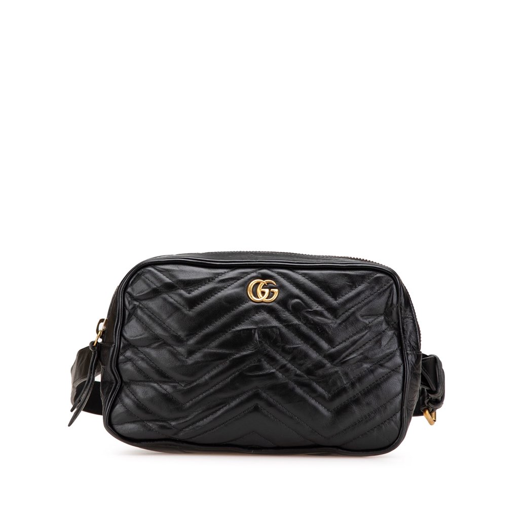 This belt bag features a quilted leather body, an adjustable flat waist strap, a top zip closure, and an interior zip pocket.
