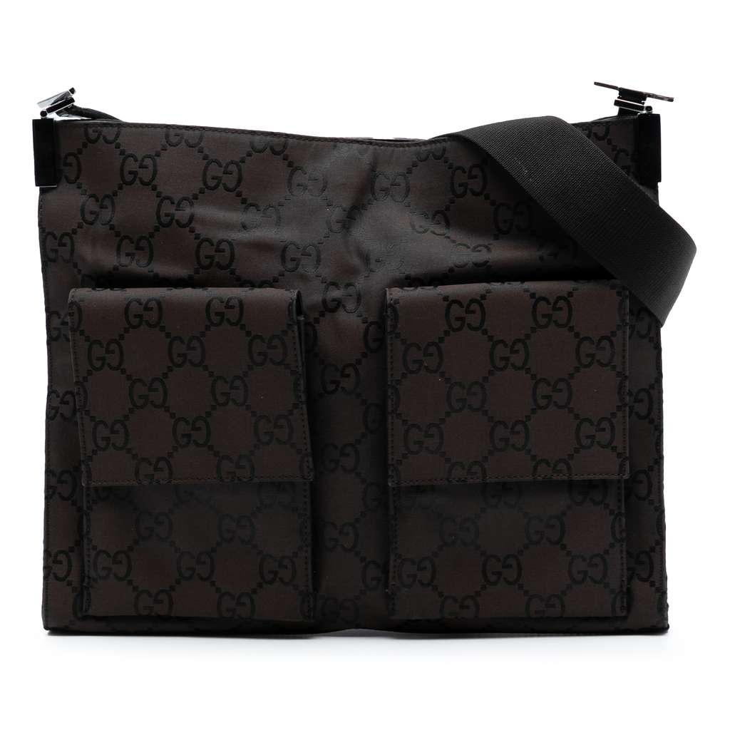 This crossbody bag features a nylon body, a flat strap, a top zip closure, exterior flap pockets, and interior zip and slip pockets.