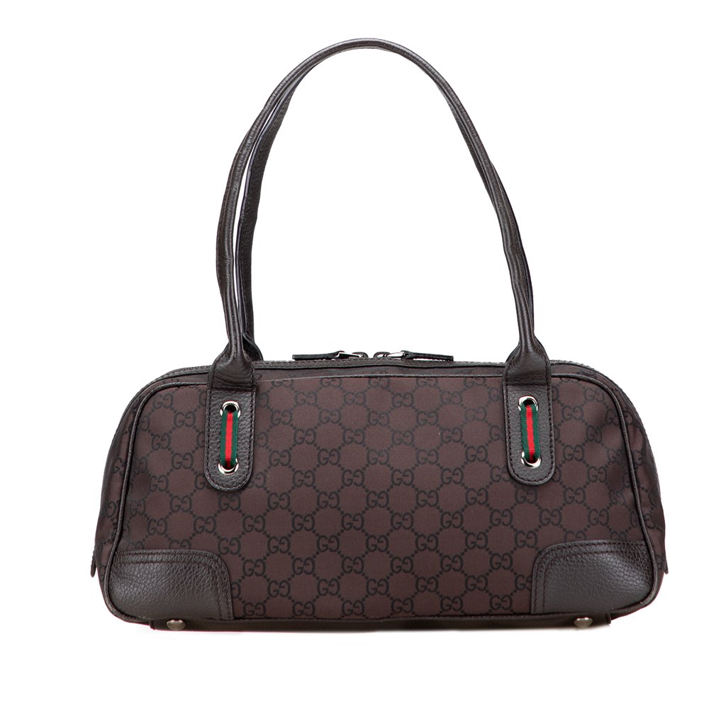 This shoulder bag features a nylon body, rolled leather shoulder straps, a top zip closure, and interior slip and zip pockets.