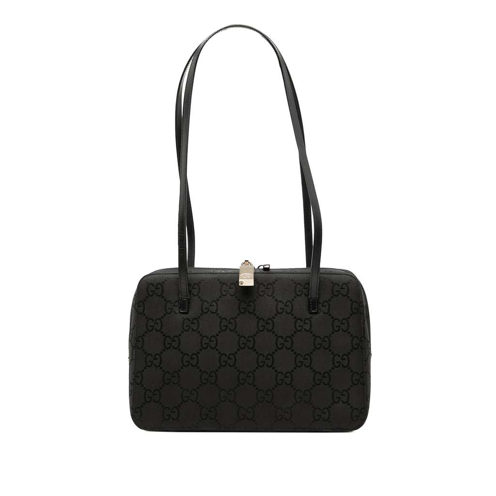 This shoulder bag features nylon body, flat leather shoulder straps, a top zip closure, and an interior zip pocket.