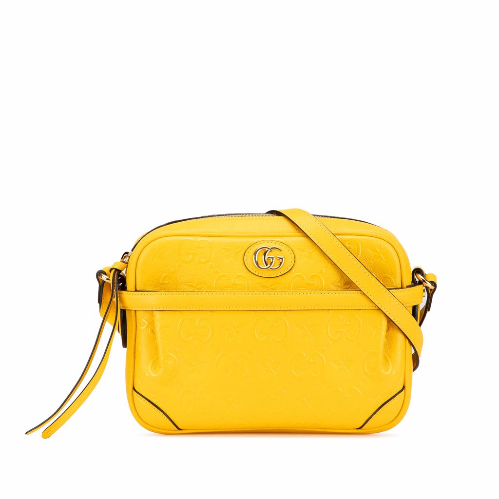 This crossbody features an embossed leather body, an adjustable flat leather strap, a top zip closure, an exterior slip pocket, and an interior slip pocket.