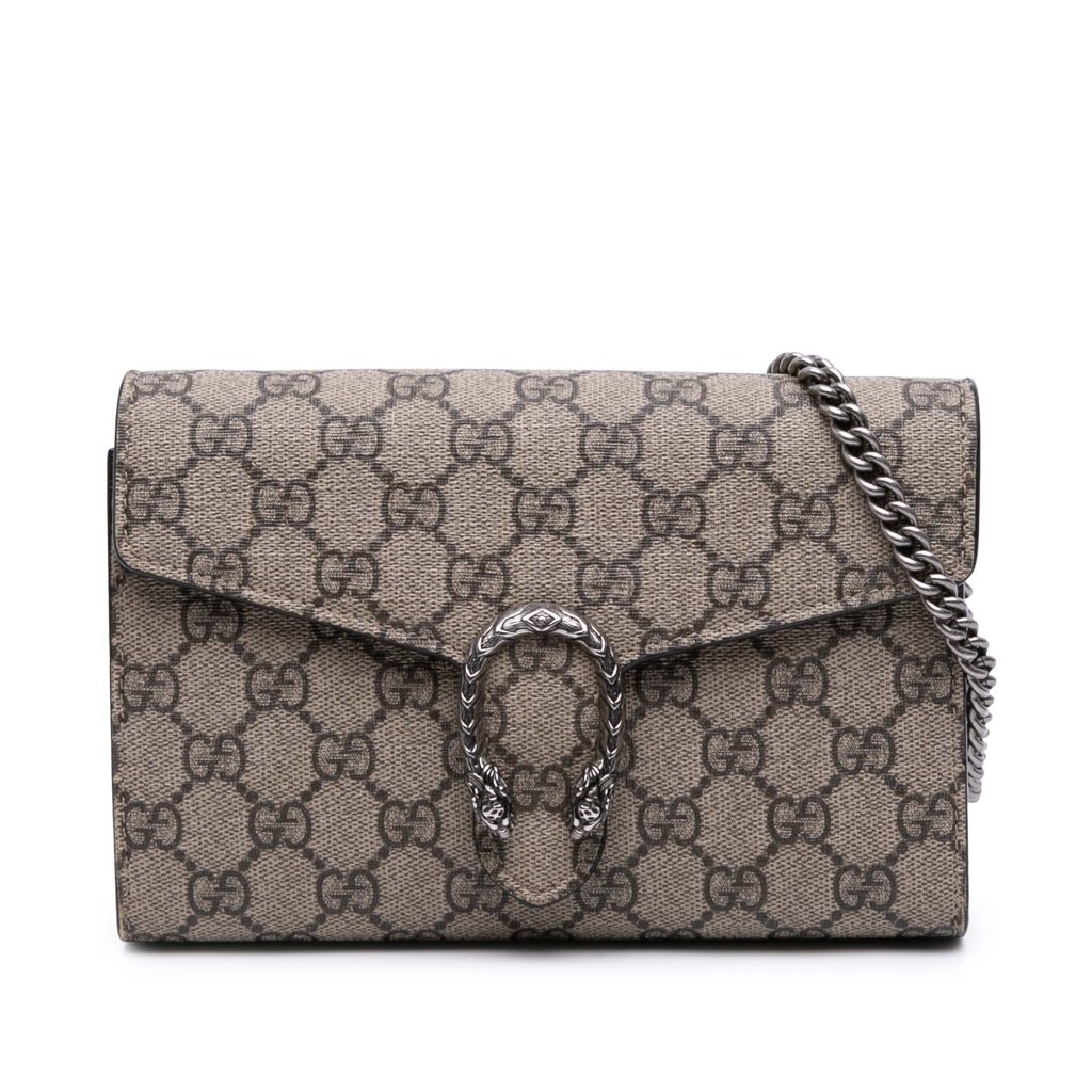 This Dionysus Wallet on Chain features a coated canvas body, a silver-tone curb chain strap, a front flap with a snap closure, interior zip and slip compartments, and interior slip pockets.