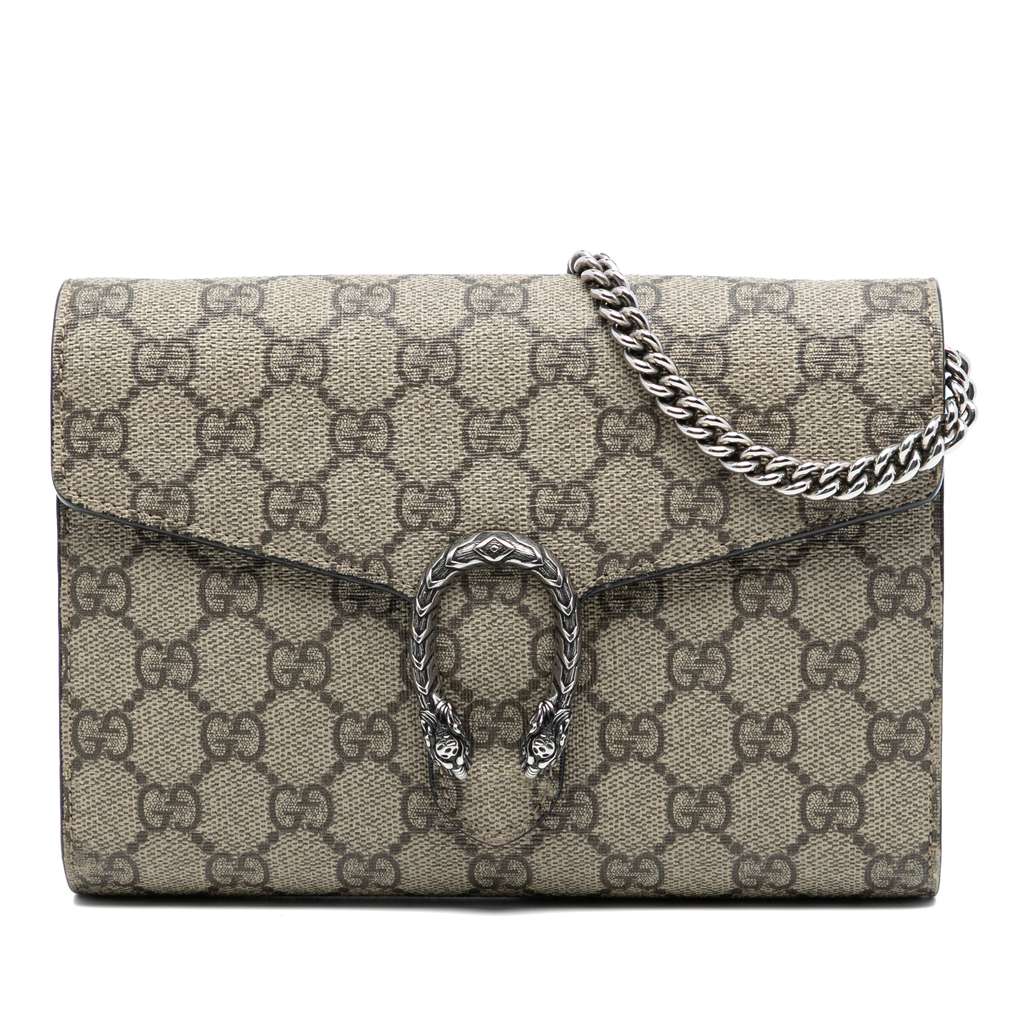 This wallet on chain features a coated canvas body, a chain link shoulder strap, a front flap with a snap closure, and interior zip and slip compartments.