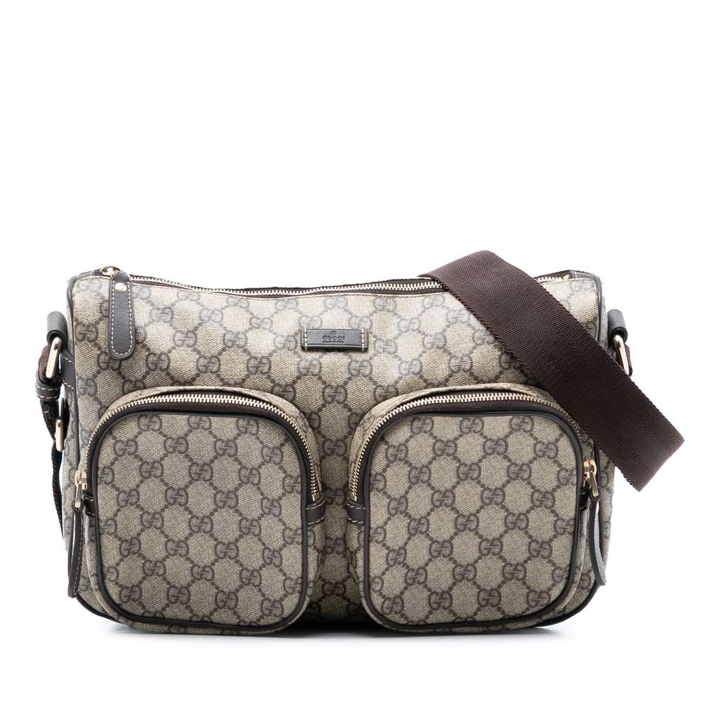This crossbody bag features a coated canvas body with leather trim, an adjustable flat shoulder strap, a top zip closure, exterior front zip pockets, and an interior zip pocket.
