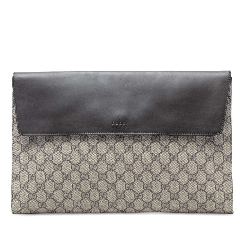 This clutch features a coated canvas body with leather trim, a front flap with snap closure, and interior slip pockets.