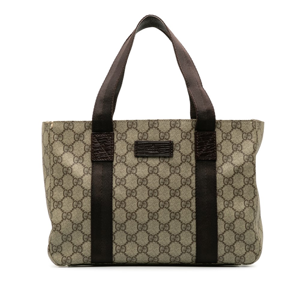 This handbag features a coated canvas body, flat leather handles, an open top, and interior slip and zip pockets.